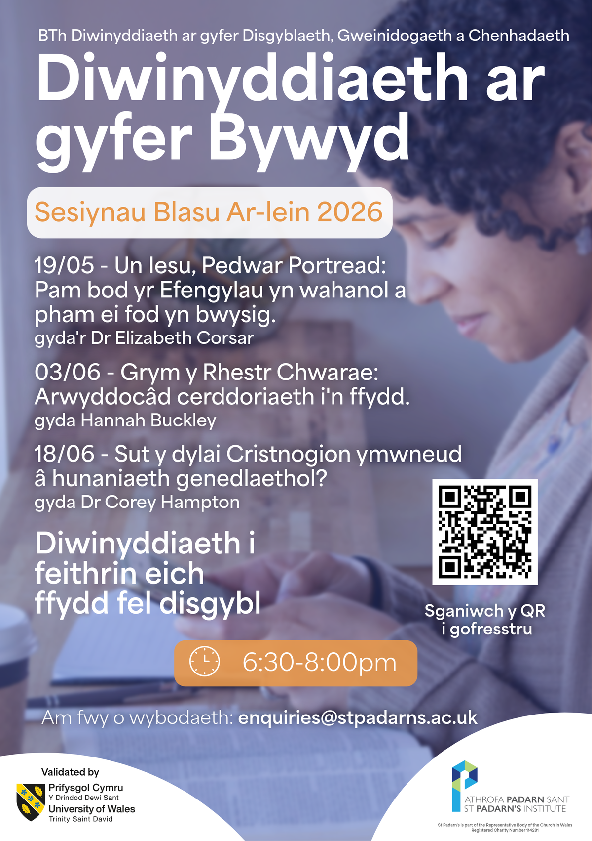 Os hynny, mae Diwiyddiaeth ar gyfer Bywyd yn berffaith i chi. Mae Diwinyddiaeth ar gyfer Bywyd yn gwrs ar-lein rhan-amser. Gallwch astudio tuag at radd, diploma neu dystysgrif a gall y cwrs eich cynorthwyo chi I gysylltu eich ffydd gyda bywyd bob dydd. Mae’n gwrs prifysgol achrededig, wedi ei ddilysu gan Brifysgol Cymru y Drindod Dewi Sant.